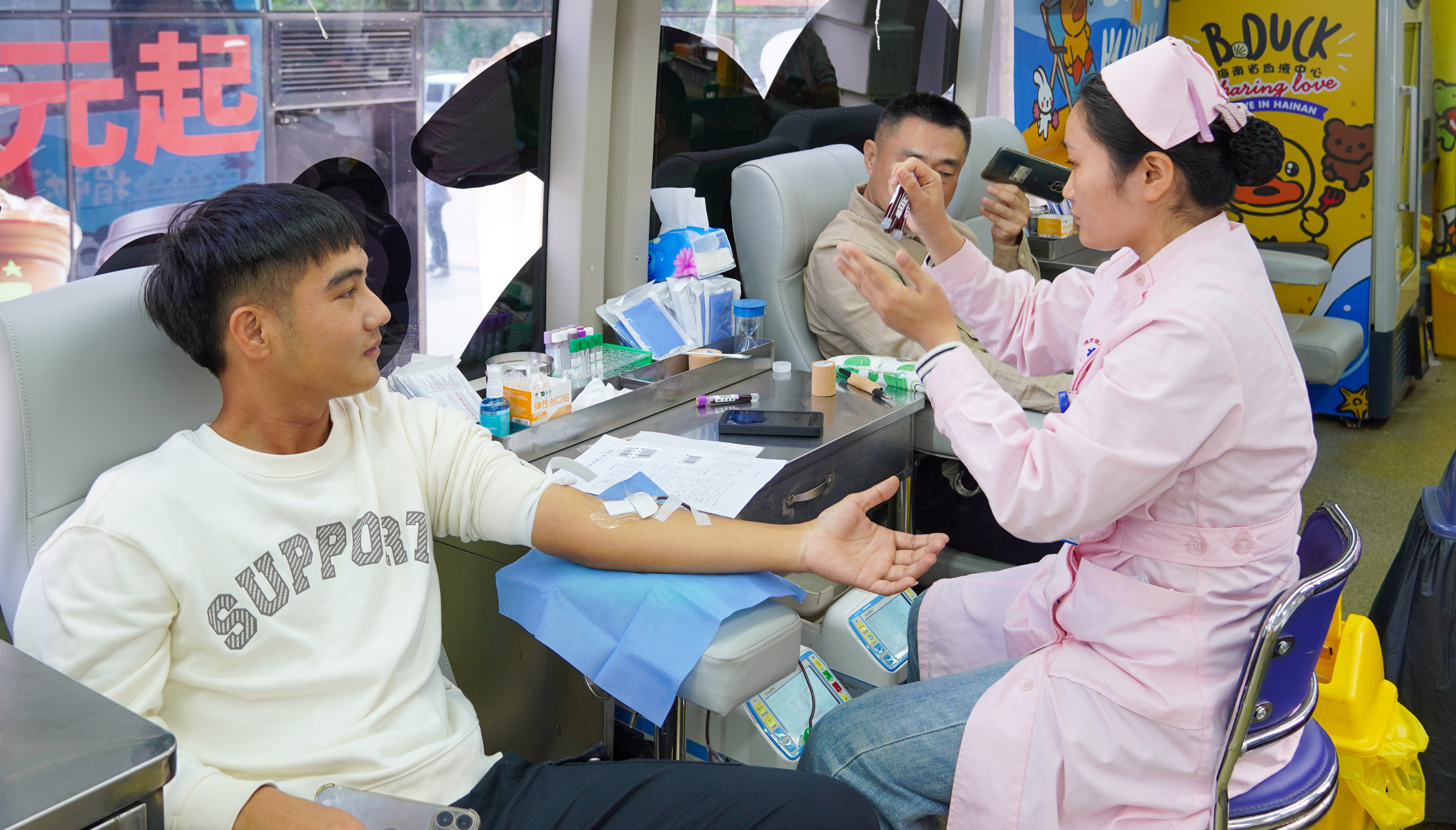 活動現(xiàn)場,參與獻(xiàn)血的員工們在海南省血液中心醫(yī)務(wù)人員的指導(dǎo)下,有序完成信息登記、血壓測量、血液化驗(yàn)初篩等流程后進(jìn)行獻(xiàn)血。獻(xiàn)血的隊(duì)伍中既有多年堅(jiān)持無償獻(xiàn)血的“老將”,也有初次參與的“新兵”,從黨員到海南民生燃?xì)獾确肿庸镜膯T工,大家以飽滿的熱情加入到這場“熱血”的隊(duì)伍中。